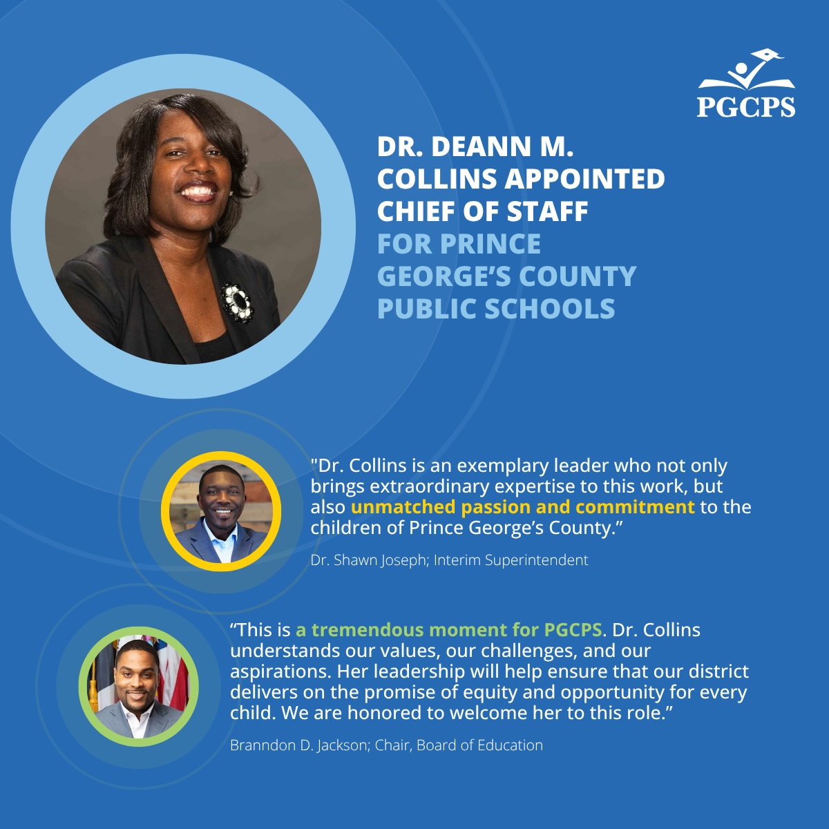“Dr. Collins is an exemplary leader who brings both the experience and heart we need at this critical time,” said Dr. Joseph. “She answered the call to serve with humility, and her leadership will ensure our systems are aligned and our goals are met. As a resident and parent in Prince George’s County, her passion for this work is personal — and our children will benefit from that every day.”