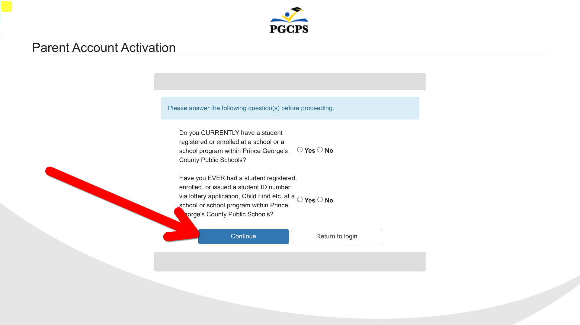 Once you have created your ParentVUE account, if you are a parent who has never had a student enrolled in PGCPS, you are taken immediately to the enrollment page