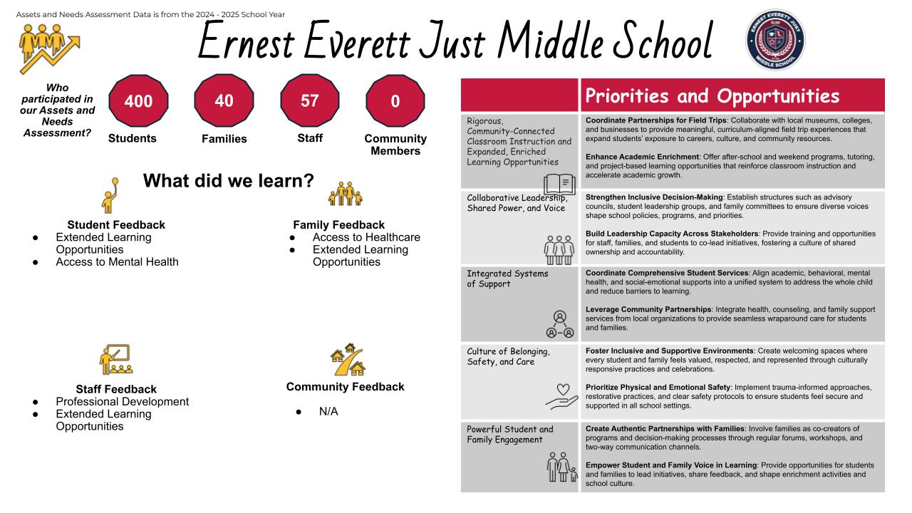 Create Authentic Partnerships with Families:Involve families as co-creators of programs and decision-making processes through regular forums, workshops, and two-way communication channels. Empower Student and Family Voice in Learning: Provide opportunities for students and families to lead initiatives, share feedback, and shape enrichment activities and school culture. |
