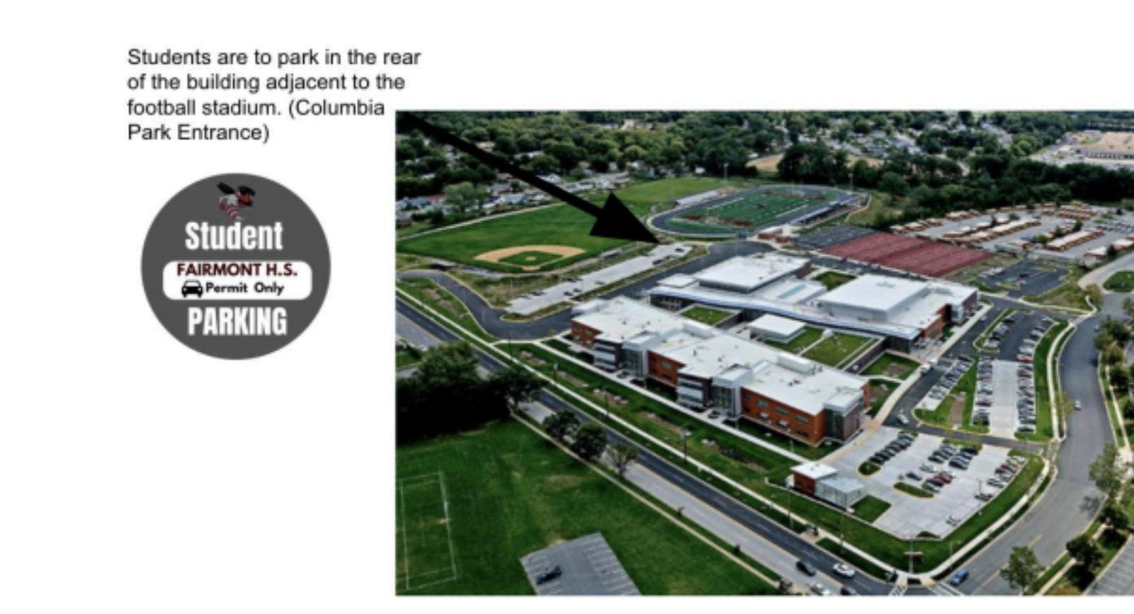 Student parking is available in the designated student parking area located in the rear lot of the building, adjacent to the football field. Please note that students are not permitted to park in the front lots, the side lot next to the tennis courts, or near the cafeteria.