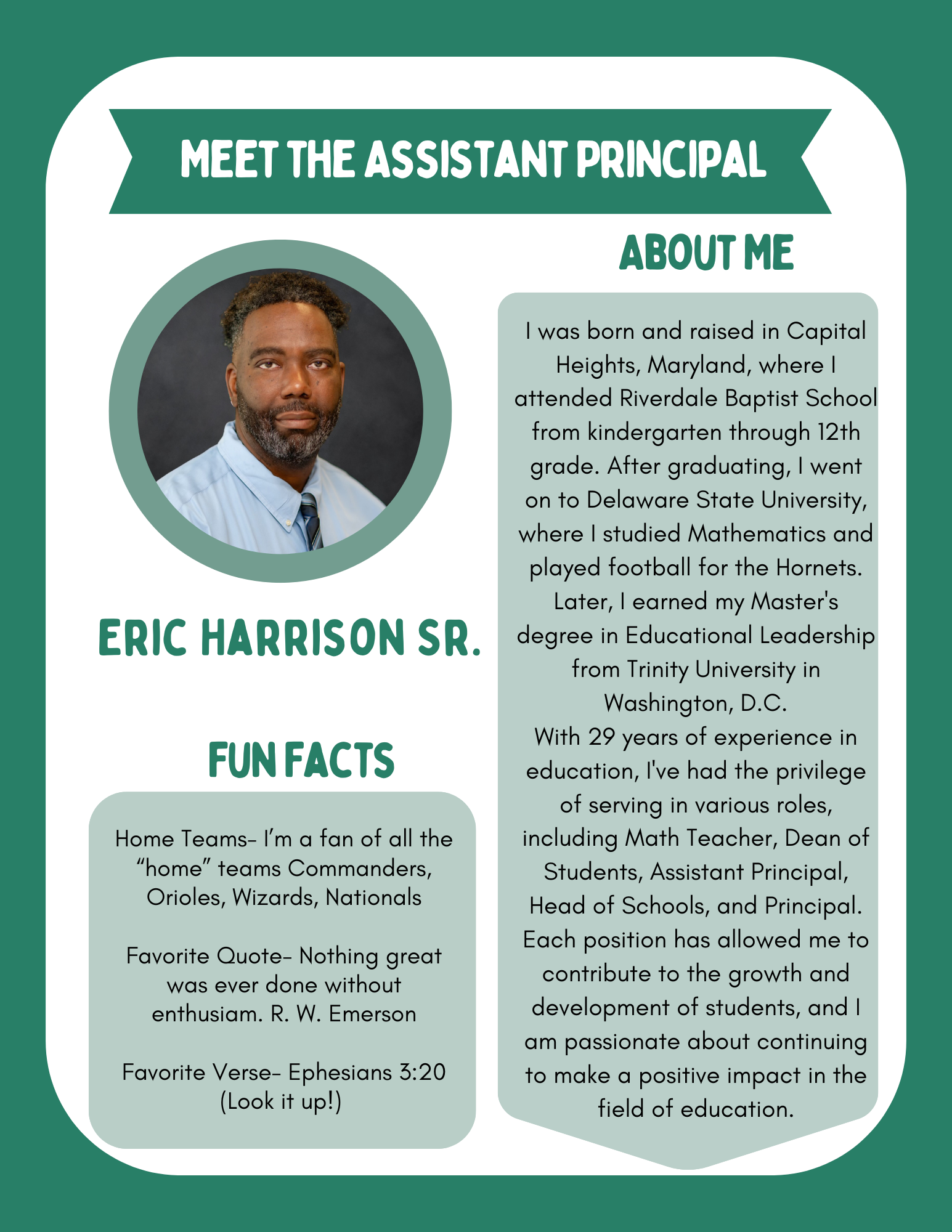 Text with Picture: Meet the Assistant Principal, Eric Harrison, Sr. About Me: I was born and raised in Capital Heights, Maryland, where I attended Riverdale Baptist School from kindergarten through 12th grade. After graduation, I went on to Delaware State University, where I studied Mathematics and played football for the Hornets. Later, I earned my Masters degree in Educational Leadership from Trinity University in Washington, DC. With 29 years of experience in education, I've had the privilege of serving in various roles, including Math Teacher, Dean of Students, Assistant Principal, Head of Schools and Principal. Each position has allowed me to contribute to the growth and development of students, and I am passionate about continuing to make a positive impact in the field of education. Fun Facts: Home Teams - I'm a fan of all the "home" teams, Commanders, Orioles, Wizards and Nationals. Favorite Quote: "Nothing great was ever done without enthusiasm." R.W.Emerson. Favorite Verse: Ephesians 3:20 (Look it up!)