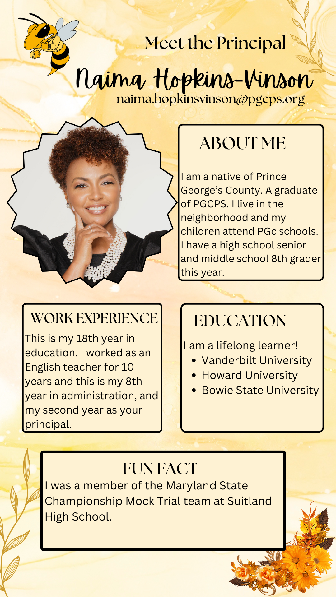 About Me: I am a native of Prince George's County.  A graduate of PGCPS.  I live in the neighborhood and my children attend PGCPS schools.  I have a high school senior and middle school 8th grader this year.  Work Experience: This is my 18th year in education. I worked as an English teacher for 10 years and this is my 8th year in administration, my second year as your principal. Education: I am a lifelong learner!  Vanderbilt University, Howard University, and Bowie State University.  Fun Fact: I was a member of the Maryland State Championship Mock Trial team at Suitland High School.