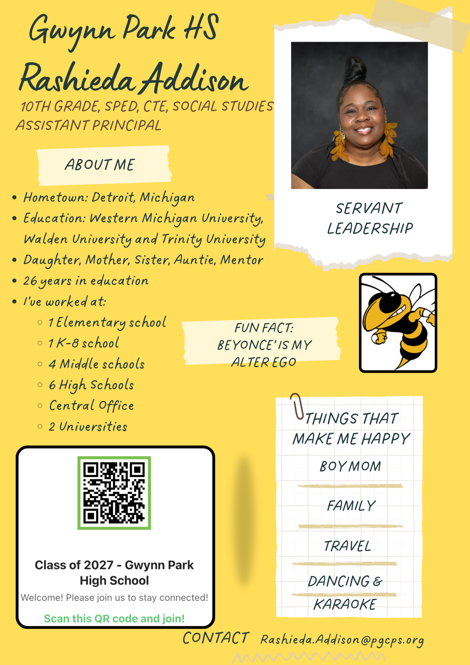 About Me: Hometown, Detroit, Michigan; Education, Western Michigan University, Walden University, and Trinity University; Daughter, Mother, Sister, Auntie, Mentor; 26 years in Education; I've worked at 1 elementary school, 1 K-8 school, 4 middle schools, 6 high schools, central office and 2 universities. Fun Fact: Beyonce is my Alter Ego. Things That Make Me Happy, Boy Mom, Family, Travel, Dancing and Karaoke. Class of 2027 - Gwynn Park High School Welcome! Please join us to stay connected. Scan this QR code and join!