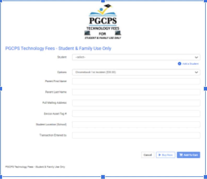 Todos los estudiantes inscritos en las Escuelas Públicas del Condado de Prince George ("PGCPS") recibirán un dispositivo informático (como un Chromebook, laptop, tableta, iPad o eReader) y un adaptador de corriente para apoyar a su aprendizaje. Todos los dispositivos y accesorios asignados a los estudiantes son propiedad de las Escuelas Públicas del Condado de Prince George y están prestados al estudiante. Se pueden determinar cuotas para todo estudiante que pierda o dañe un dispositivo emitido por PGCPS en el hogar o la escuela, como se indica a continuación.