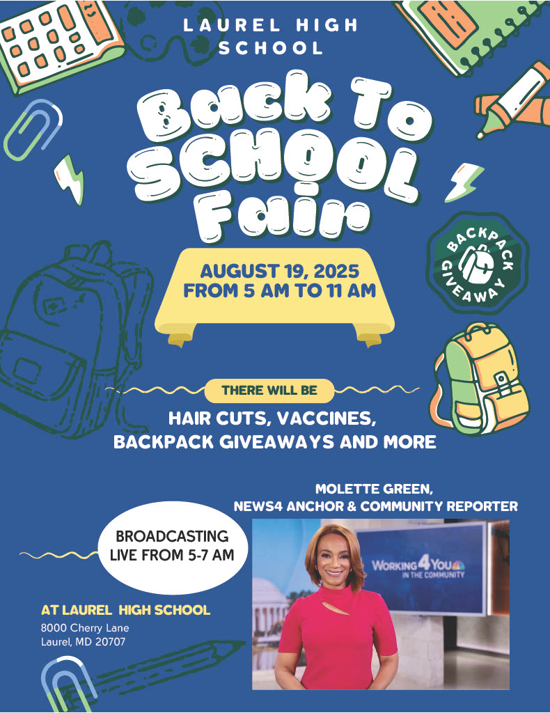 We are excited to invite you to our Back to School Fair on Tuesday, August 19, 2025, from 5:00 AM to 11:00 AM at Laurel High School!